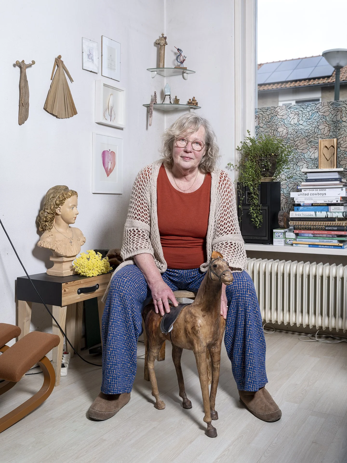 And once the little horse was with me, I became even more enthusiastic about it because it's such a special horse. And now I'm even thinking about going to ‘Kunst en Kitsch’ or something. Not to know what it's worth, but to know the story behind this horse with all that tightly stretched leather. I've never seen it, and I'm very curious where it came from and how old it is and all that. And I've also heard that the grandchildren used to climb on it, so it still looks remarkably intact. I took it home and then I thought: it'll be nice for the grandchildren, because ++ loves horses so much. But once it was inside, I thought: I'll just keep it downstairs, because I think it's so nice to look at.